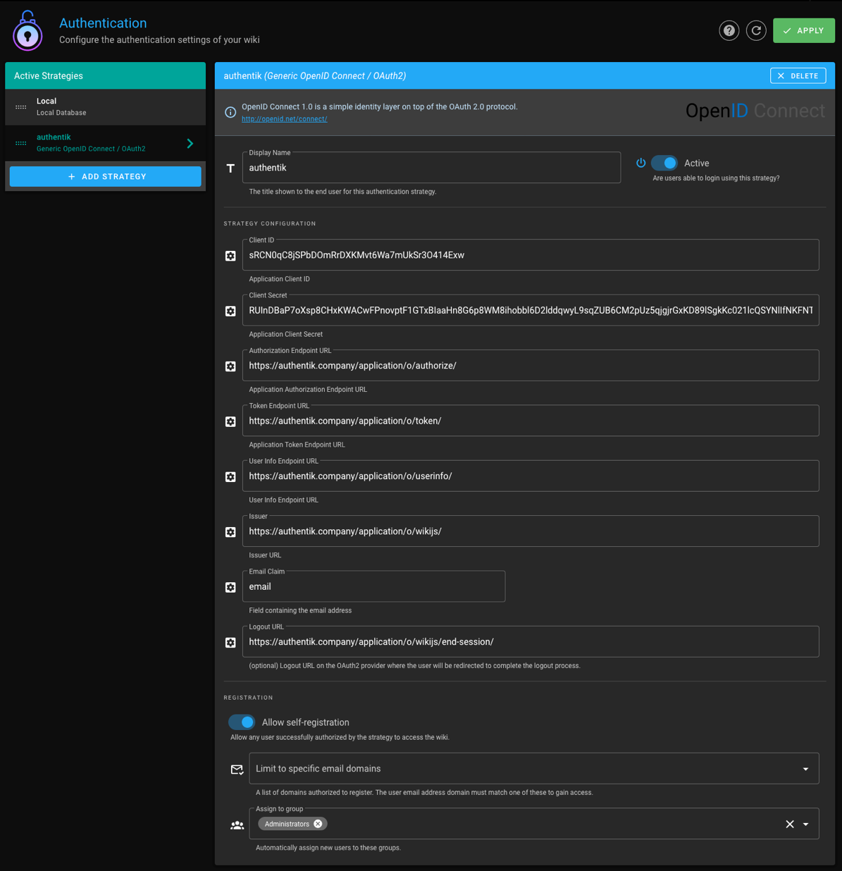 - Logout URL: https://authentik.company/application/o/wikijs/end-session/