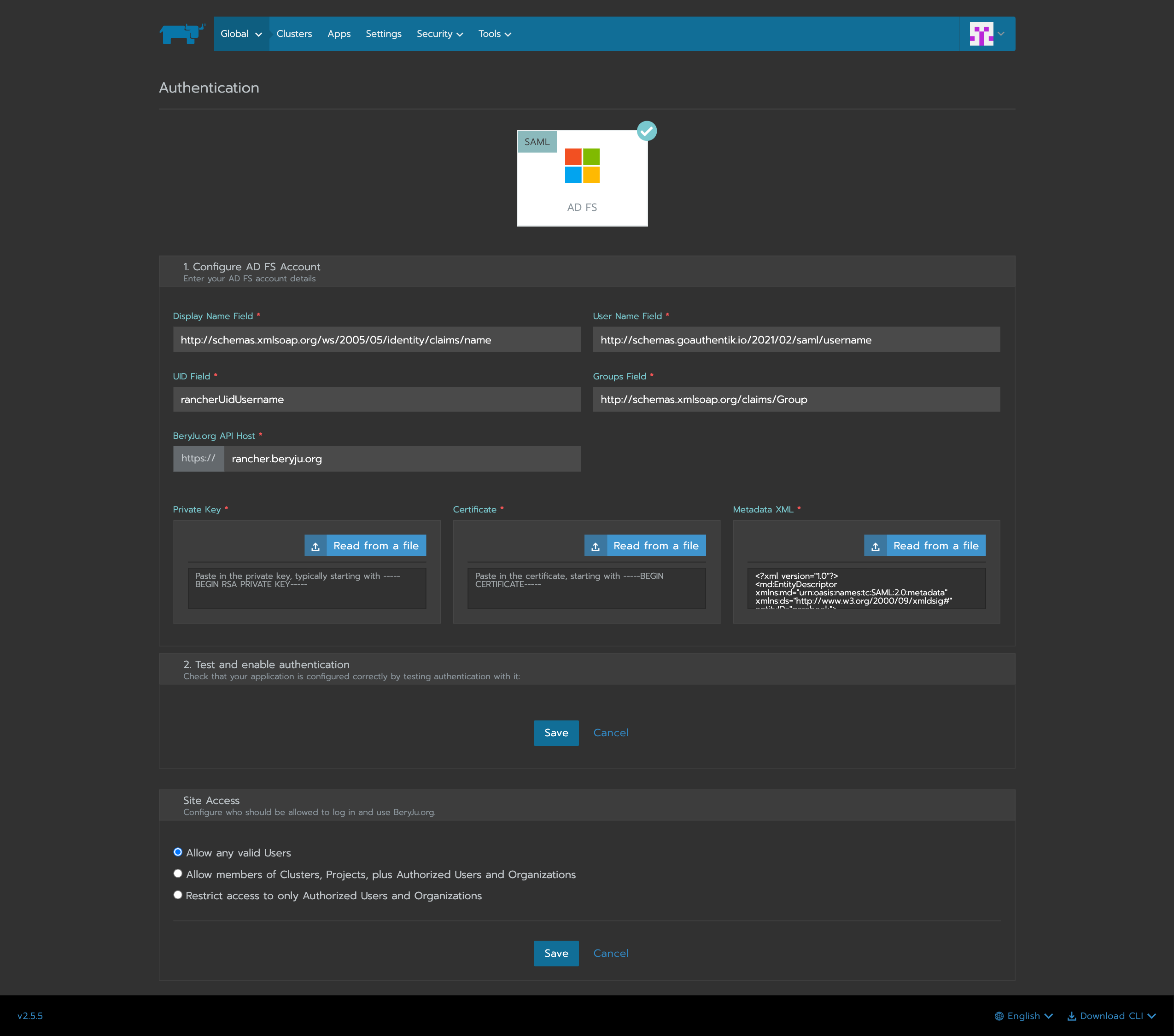 In Rancher, navigate to Global -> Security -> Authentication, and select ADFS.