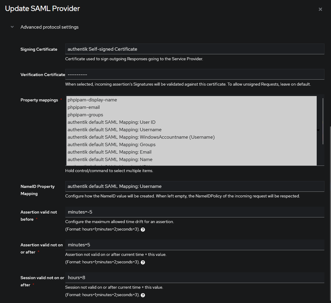 This is based on authentik 2023.3.1 and phpIPAM 1.5.2 Only settings that have been modified from default have been listed.