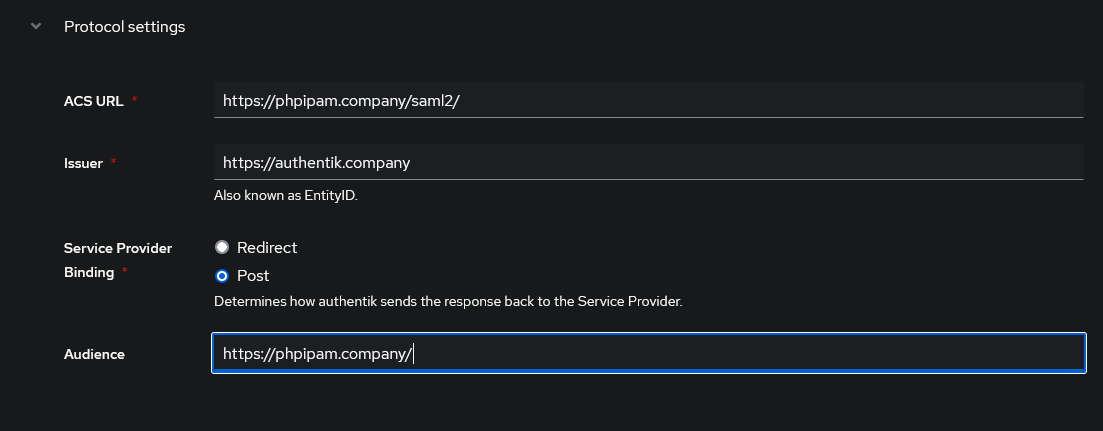 - IDP Login url: https://authentik.company/application/saml/*application_name*/sso/binding/redirect/